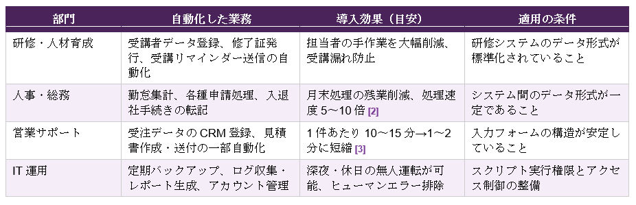 - スモールスタート:まず1業務でPoC(概念実証)を行い、SOP(Standard Operating Procedure=業務手順書)を整備してから自動化する。ある製造業では1年間で54業務をロボット化し、累計1,850時間の工数削減を達成した。 [1]