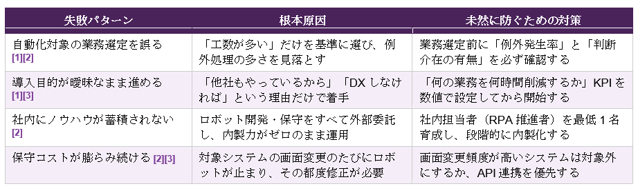 [3] RoboTANGO. RPA導入で失敗する原因は?事例や対策. https://robotango.biz/knowledge/rpa-failure/