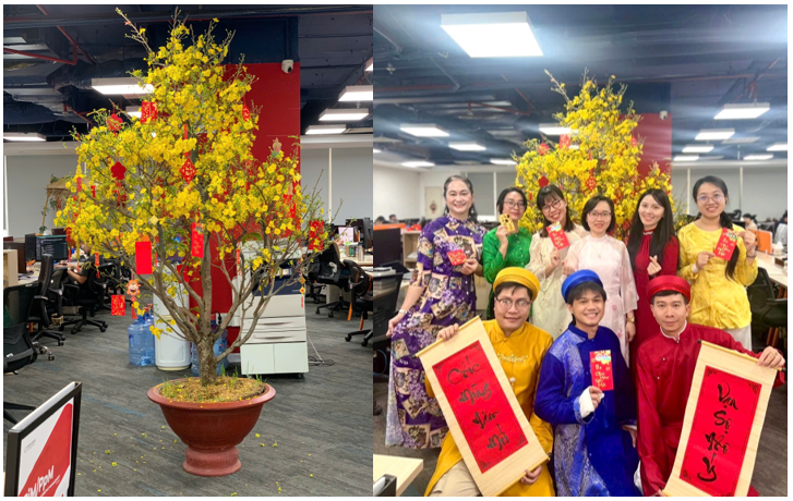このようなオフィス装飾は、社員が働きながらもテトの温かな雰囲気や季節感を感じられるだけでなく、職場の一体感を高め、組織全体が新しい一年のスタートを前向きに迎えることに繋がっています。